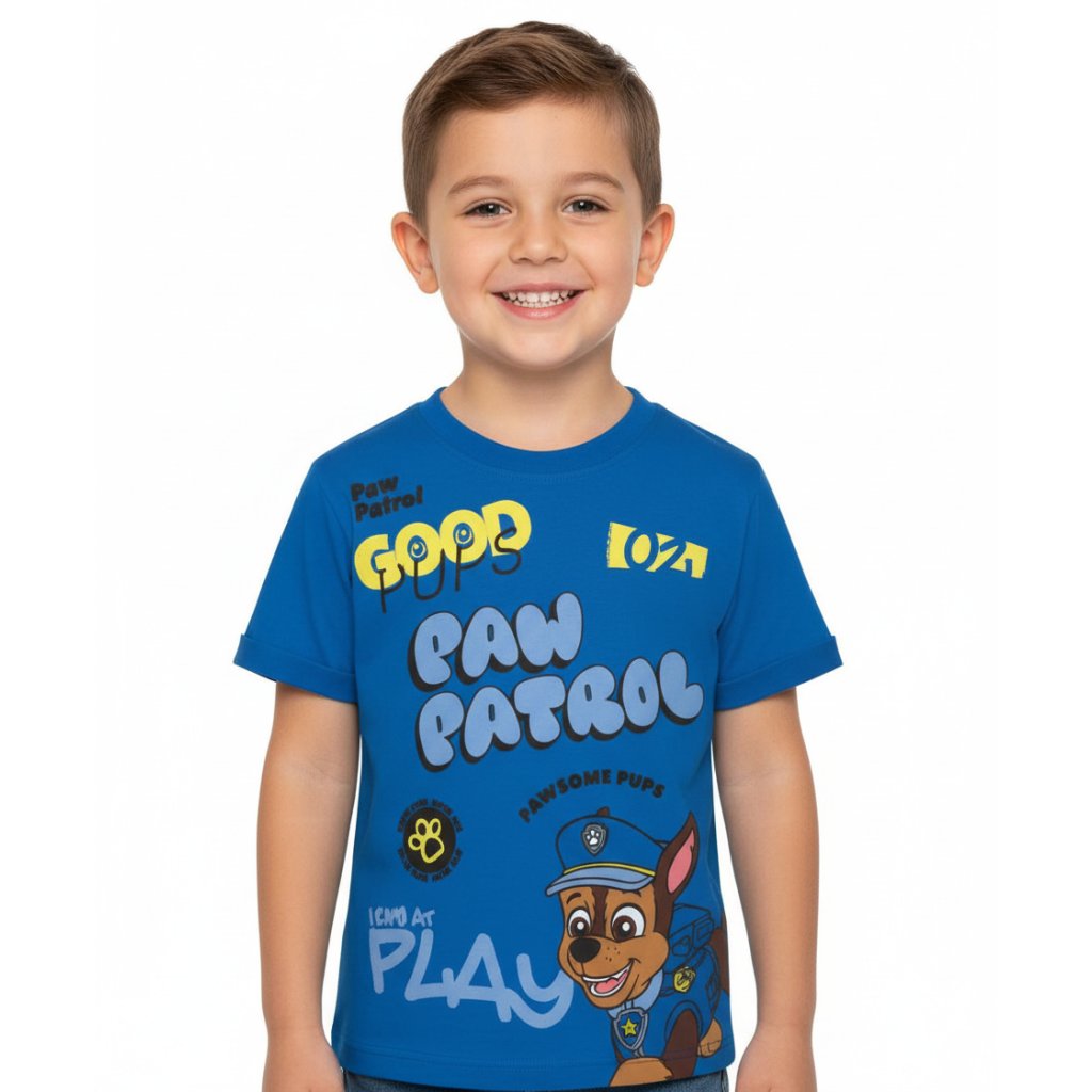 Camiseta de manga corta de la colección Patrulla Canina, disponible en dos colores, azul y blanco. Tallas de la 3 a la 6.