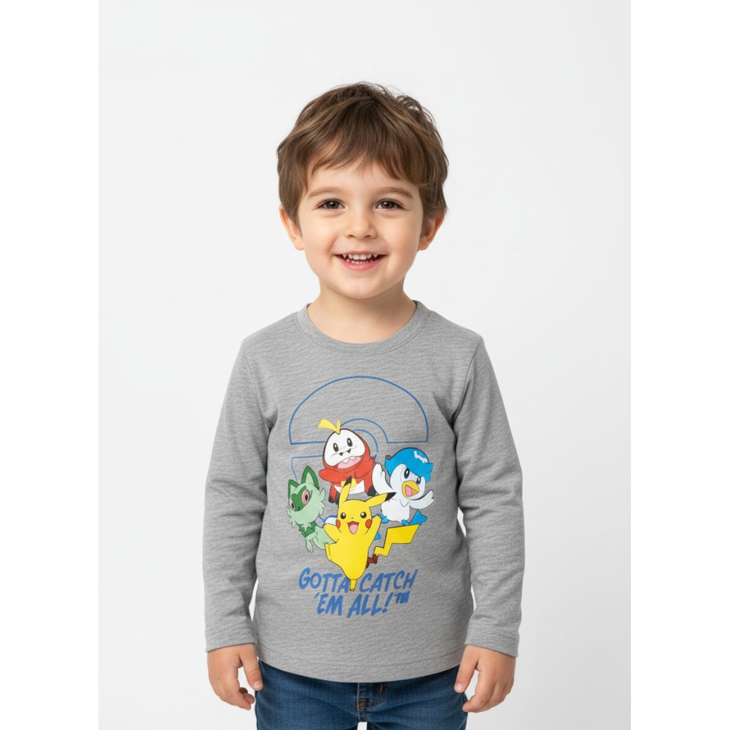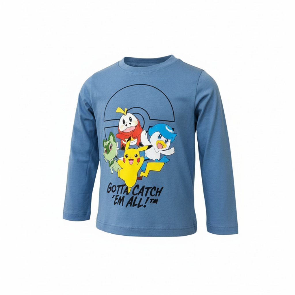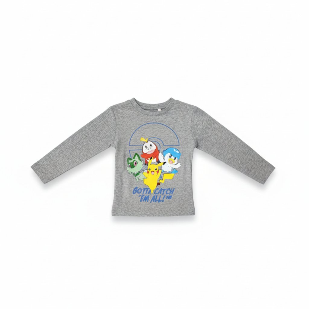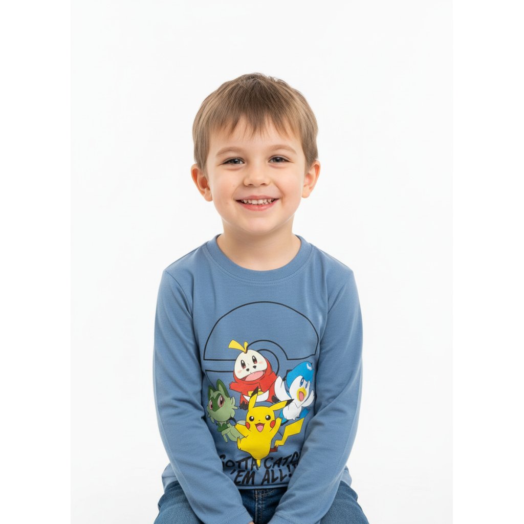 Camiseta de la colección Pokemon, fabricada en algodón con materiales de alta calidad, disponible en dos colores, azul y gris. Tallas de la 4 a la 12.