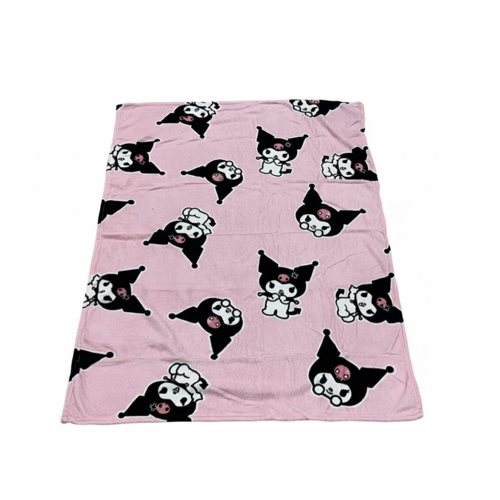 ¡Descubre la Manta coralina Kuromi que te robará el corazón! Esta adorable manta rosa pastel está cubierta con el travieso personaje Kuromi en diferentes poses divertidas. Su diseño juguetón, con los contrastes en blanco y negro de Kuromi sobre el fondo rosado, la hace irresistiblemente coqueta. Medidas: 100 x 140cm.
