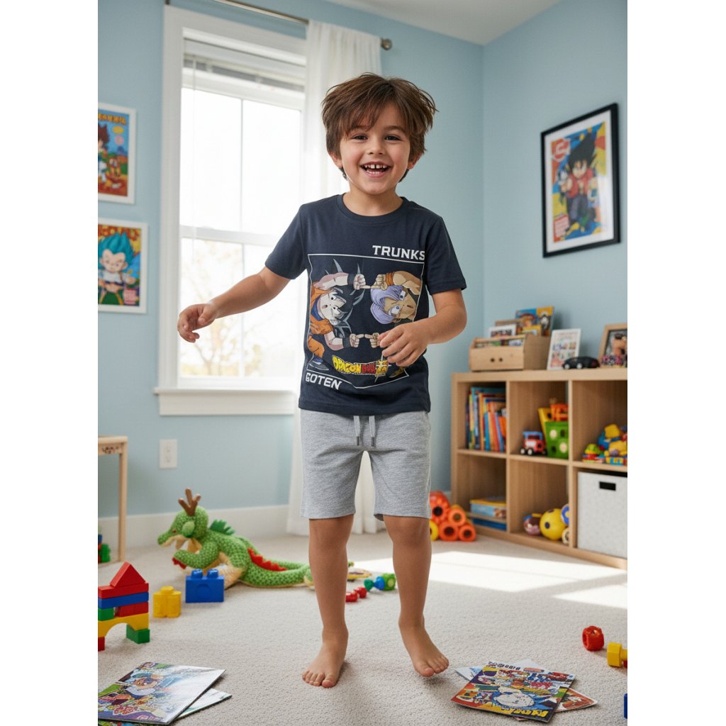 El pijama Dragon Ball es la elección perfecta para los fans de la icónica serie que buscan comodidad y estilo durante las noches más cálidas. Este set de dos piezas, ideal para las estaciones de verano y primavera, combina un diseño vibrante con la máxima funcionalidad. La camiseta de manga corta presenta un estampado dinámico de Goten y Trunks realizando la fusión, con los nombres ‘GOTEN’ y ‘TRUNKS’ claramente visibles, evocando la energía de Dragon Ball Super. El pantalón corto de color gris liso complementa a la perfección la parte superior, asegurando un look coordinado y desenfadado. Disfruta de la ligereza y suavidad que ofrece este pijama dragon ball, diseñado para garantizar un descanso placentero y lleno de aventuras, convirtiéndolo en un imprescindible para cualquier seguidor.