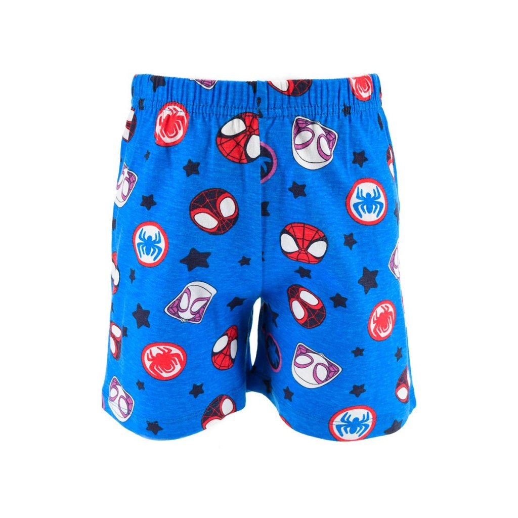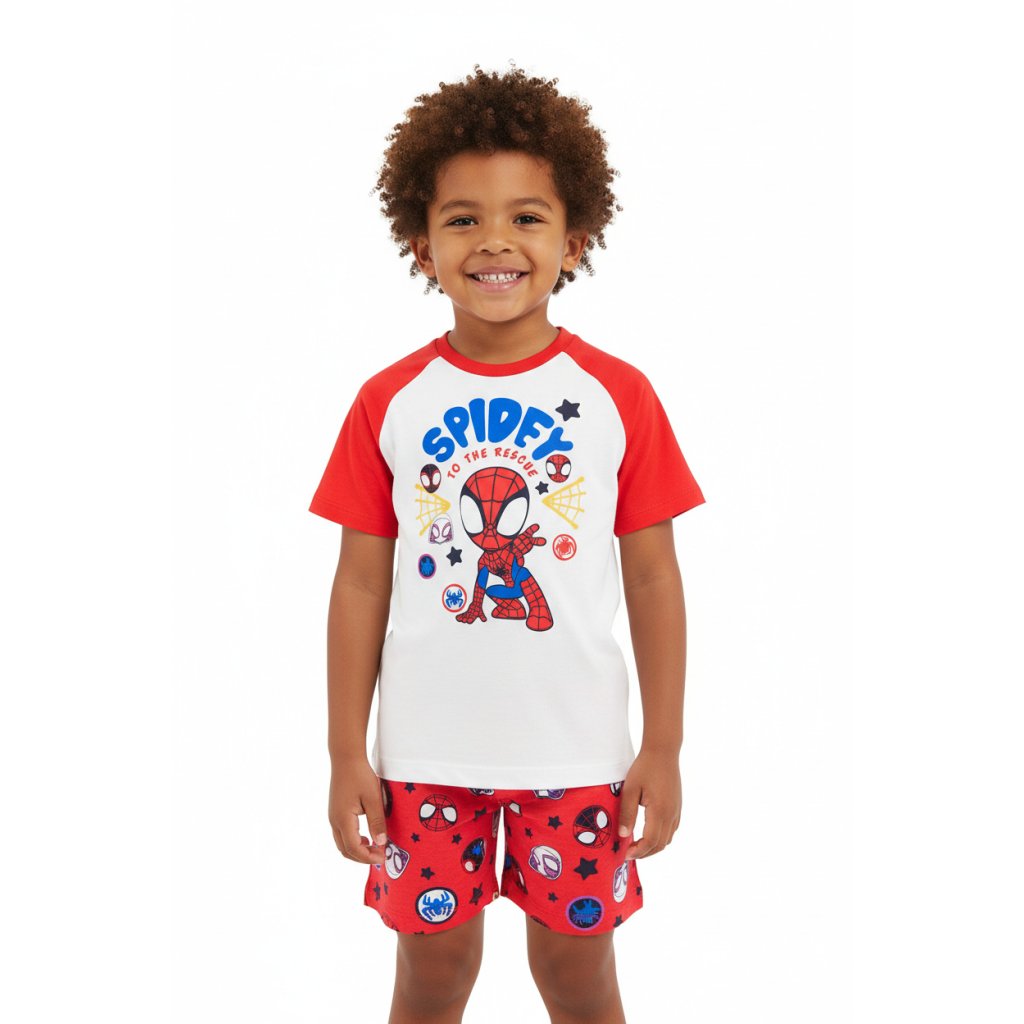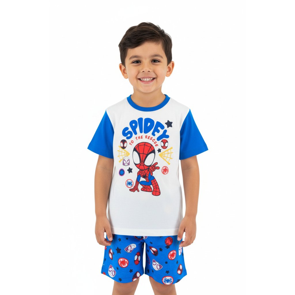 Pijama spidey manga corta con pantalón ajustable en cintura. Disponible en dos colores, azul y rojo, tallas de 2 a 5 años.
