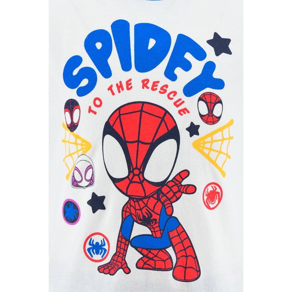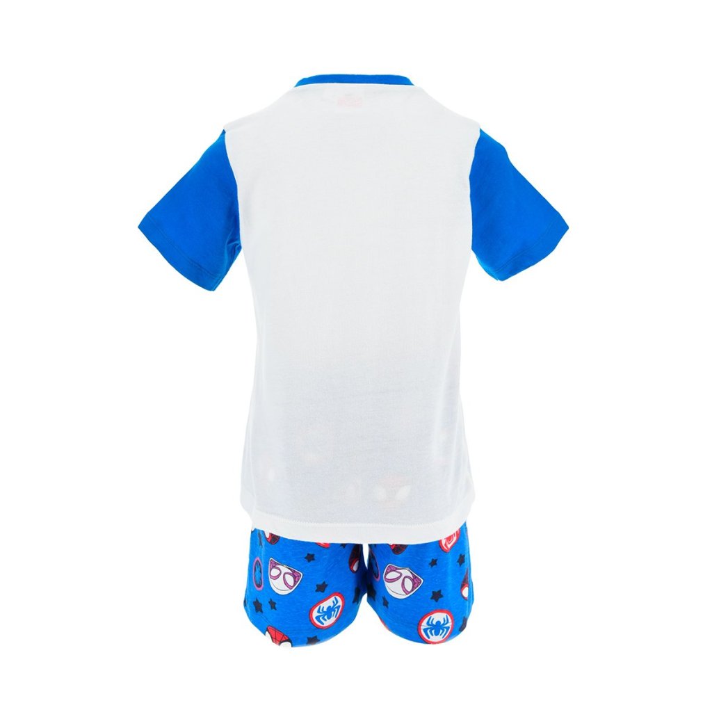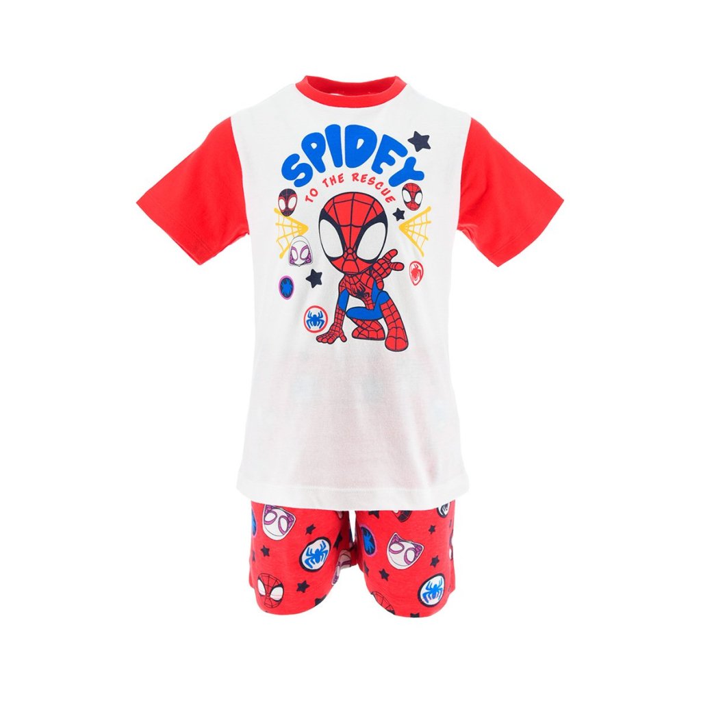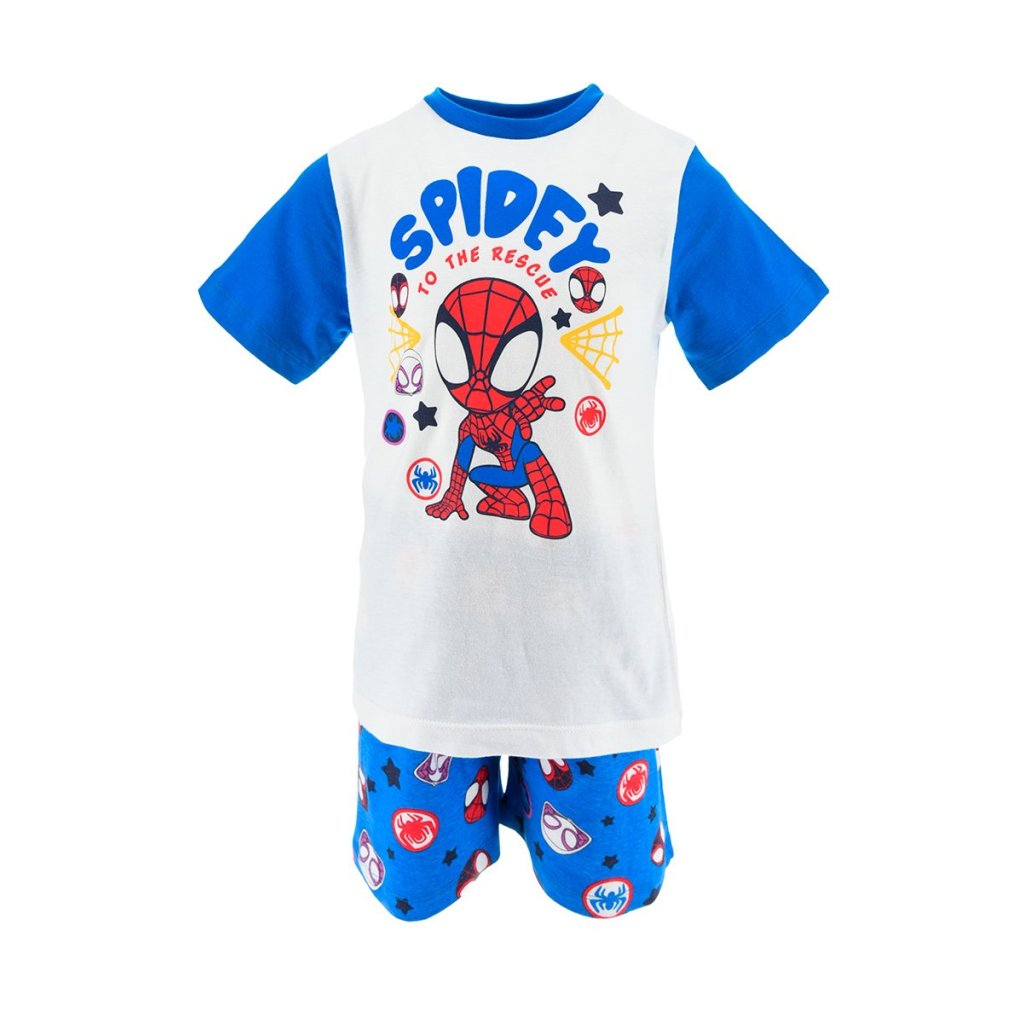 Pijama spidey manga corta con pantalón ajustable en cintura. Disponible en dos colores, azul y rojo, tallas de 2 a 5 años.