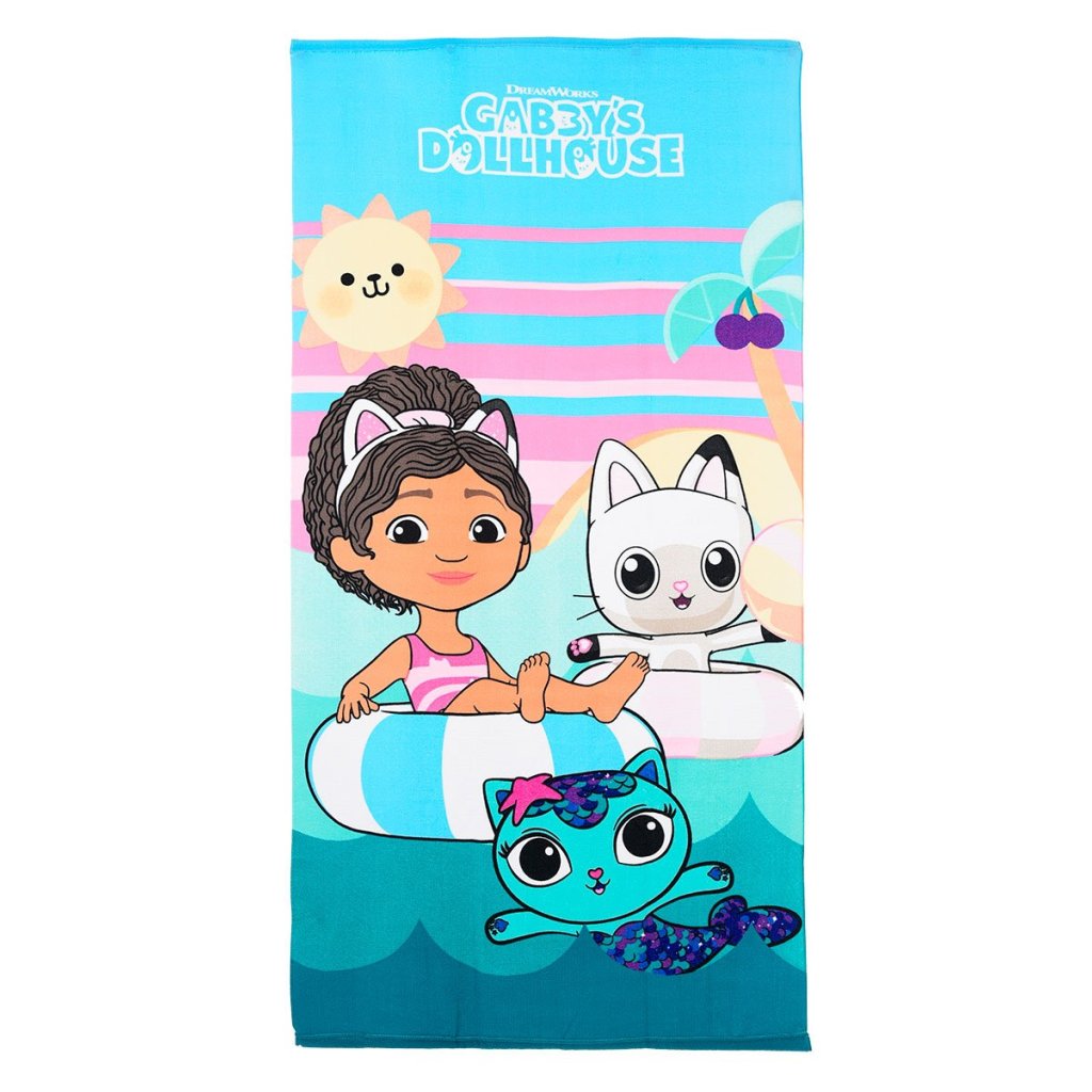 Toalla Gabbys Dollhouse fabricada con material 100% microfibra de alta absorción. Dimensiones: 70 x 140 cm, tamaño ideal para niños.